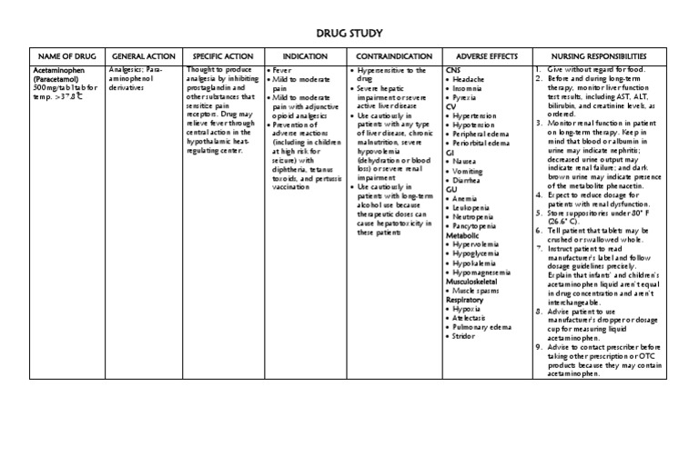 Paracetamol Drug Study Drug Order Drug Name Paracetamol Dosage 500mg Route Od Frequency Prn Q4 Date Ordered Other Preparation Dosage 300mg Route Course Hero